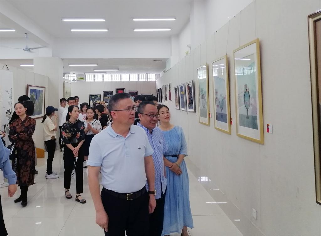 朱其现、刘艳、张锋、林成、王倩以及美术教研室的全体师生一同观看展出作品,并同毕业生一起合影留念。