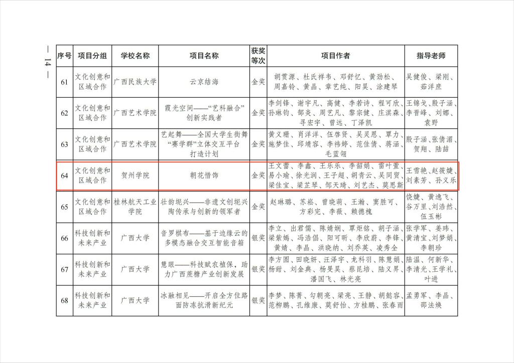 6月17日至18日,第十届“挑战杯”广西大学生创业计划竞赛决赛在广西民族大学相思湖校区举行。本届大赛启动以来,共收到广西全区78所高校的12037件作品,参赛作品数量和决赛作品数量均创下历年新高。参赛作品涵盖科技创新、乡村振兴、社会治理、公共服务、生态环保、文化创意与区域合作等领域。本次竞赛我校共组织199项创新创业项目报名参赛,经校赛选拔,20项项目参加区赛评审,其中我院惜颜团队《朝花惜饰》项目获得金奖。