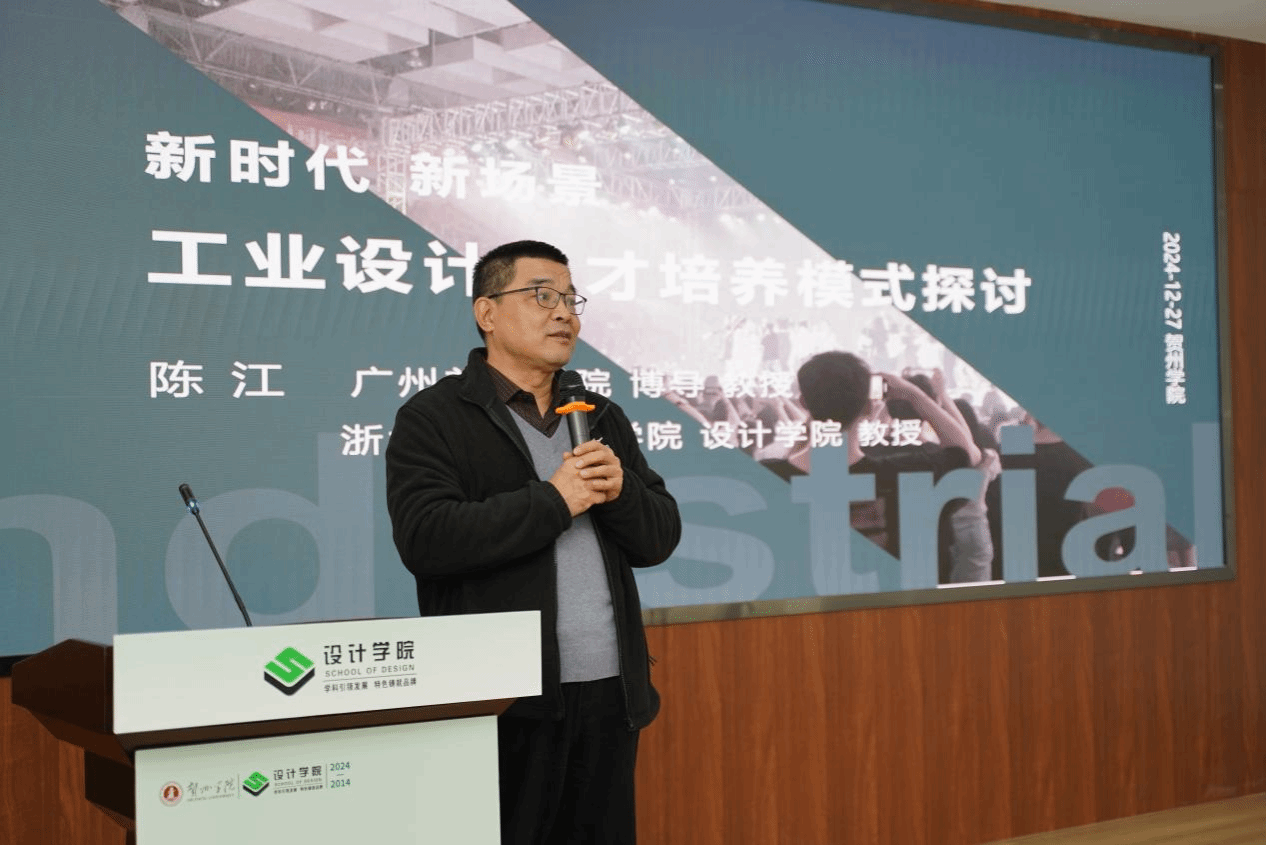 陈江教授以《新时代新场景工业设计人才培养模式探讨》为主题作主旨发言,结合时代背景、数据和案例,提出未来卓越设计人才的培养目标是基于想象力的创新能力和基于实践力的建构能力。