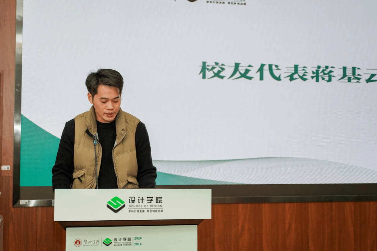 学院校友代表蒋基云发言。他讲述自己在母校的宝贵时光,对母校给予的培养和关怀表达了深深的感恩,同时,分享了从学校到社会的经历和感悟,以及母校精神如何激励自己在各个领域取得成就,鼓励学弟学妹们珍惜在校时光,勇于探索,敢于创新,为社会贡献自己的力量。