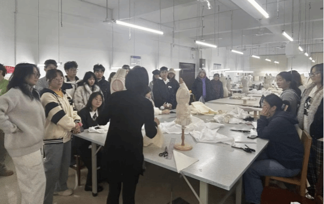 观摩课上,陆俞志老师讲授立体裁剪技法,课堂化身立体创意工坊。学生围立人台,指尖翻飞间,素白胚布神奇幻化为贴合人体的流畅衣褶。陆老师强调“布与身体的对话”,在立体空间中赋予面料生命,将抽象设计图转化为可触可感的实物造型。