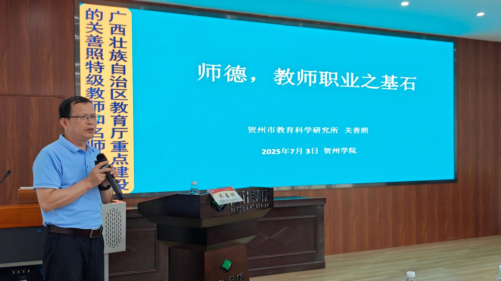为深入学习领悟教育家精神,进一步加强教师队伍建设,提升教师职业道德素养,7月3日,我院特邀广西教学名师、全国五一劳动奖章获得者,贺州市教育科学研究所科研室主任关善照开展了一场主题为“师德,教师职业之基石”的师德师风专题讲座。