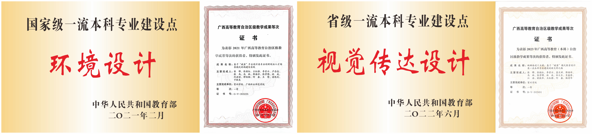 环境设计专业2020年获批国家一流本科专业建设点,为该专业广西首个获得的国家一流本科专业;视觉传达设计专业2021年入选省级本科一流专业。《威客与设计》被认定为自治区级社会实践类一流课程。2021年,《基于“威客”平台设计类专业创新创业人才培养模式的构建与实践》荣获广西高等教育教学成果奖一等奖。2023年,《砥砺奋进十五载:基于“威客”模式探索设计类一流本科专业建设的新文科之路》荣获广西高等教育教学成果一等奖。环境设计专业入选艾瑞深2022校友会中国大学专业排名(应用型)6★专业,软科2025中国大学专业排名中,环境设计专业位列B+层次。