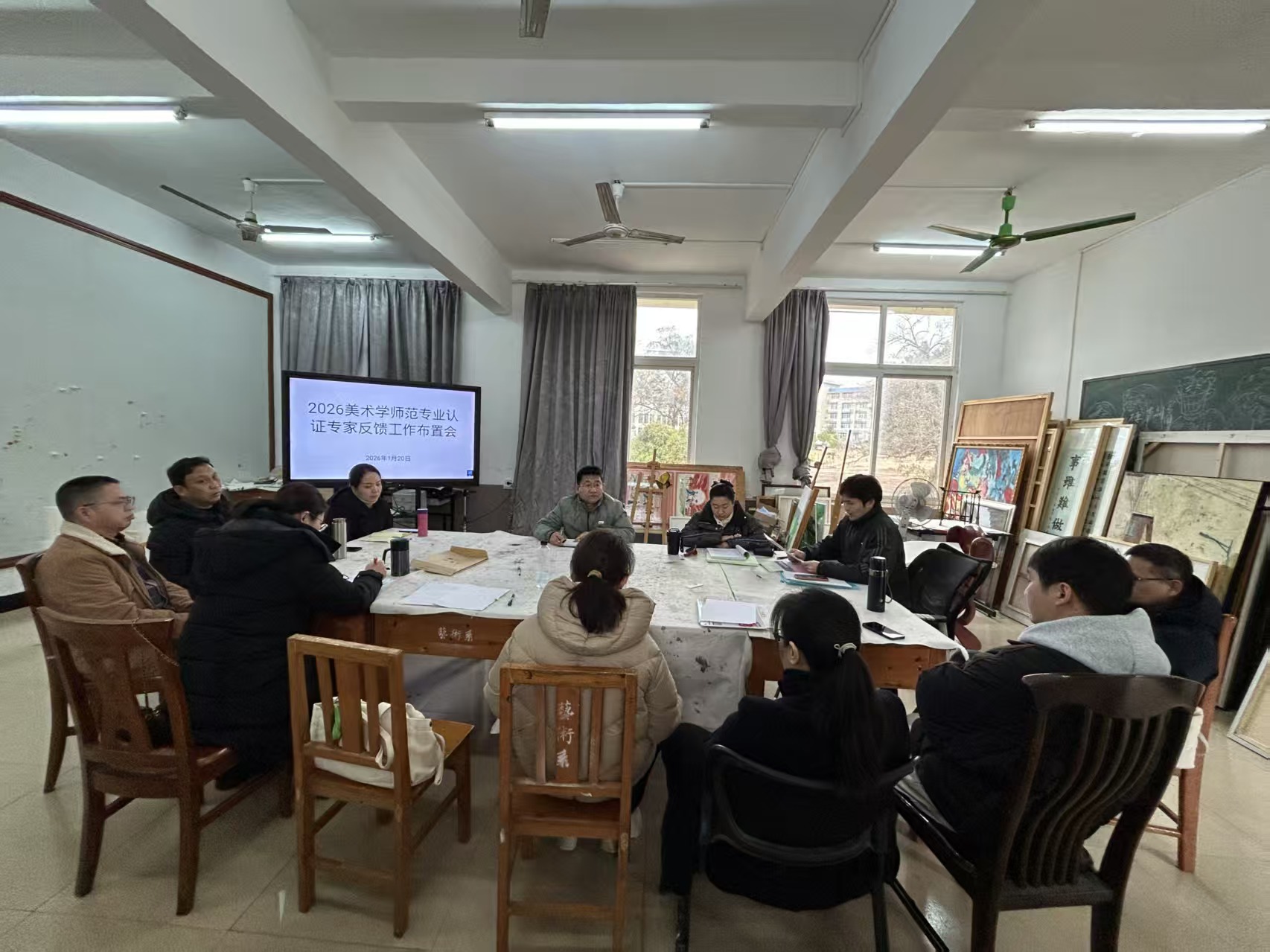 2026年1月20日,太阳集团tcy8722召开美术学师范专业认证攻坚阶段工作部署会,系统梳理前期工作进展,明确下一阶段重点任务与责任分工。会议由副院长王红静主持,美术系主任李勇、副主任吴丹及美术学专业全体教师参加。